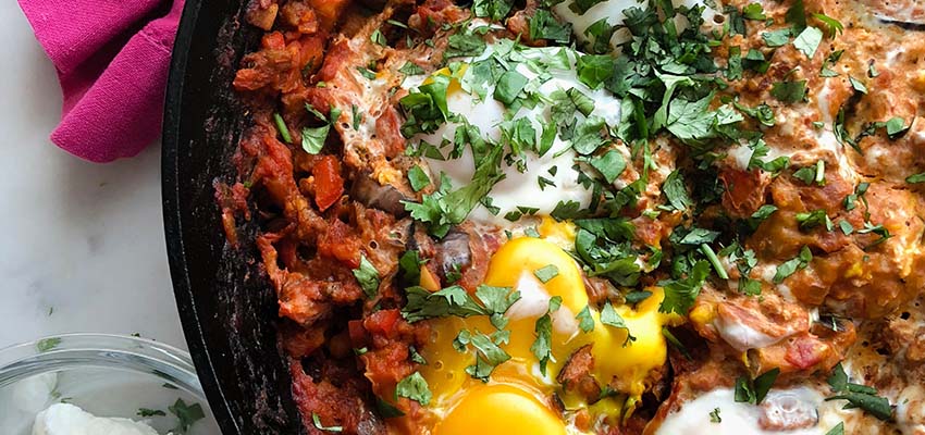 - Place the Greek yoghurt into a serving bowl with the eggs on top and pour over the chilli sauce. Garnish with a little extra mint and dill.